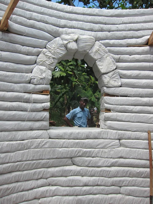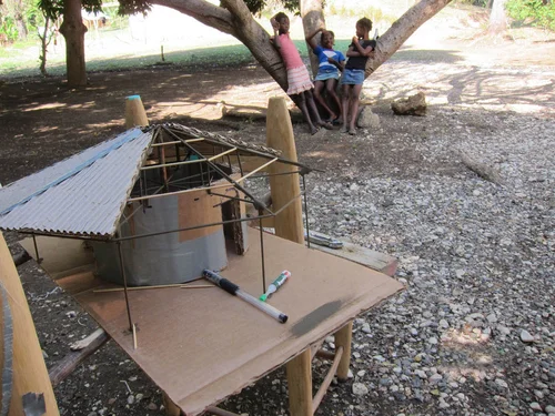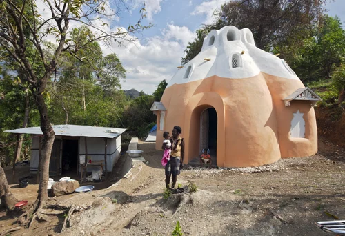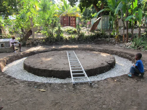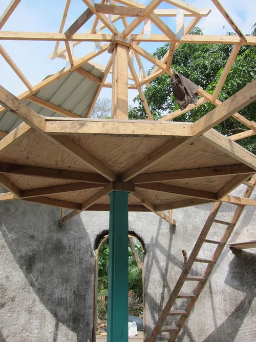 After the initial momentum of reconstruction began to slow, we took some time to gather feedback from the community. What was working about the new structures, and what wasn’t? We found that despite the super-adobe dome’s inherent strength and reliance on very little cement, the plaster’s exposure to tropical weather, combined with the high price of cement in Haiti meant that the usual maintenance required by natural building techniques was prohibitively expensive for the average Haitian salary. The next home was adapted to keep the natural disaster resilience offered by the earth-bag technique while scaling back the structure and protecting it with a metal roof.