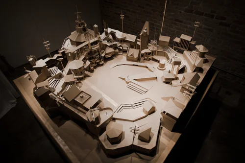 Swimming Cities of Serenissima was a fleet of sculptural junk rafts that crashed the 2009 Venice Biennale. The project was the last in a series of river-based projects founded or led by Swoon, which included Swimming Cities of Switchback Sea (2008) on the Hudson River, and the Miss Rockaway Armada (2006-2007) on the Mississippi River. Curry cites multiple sources of inspiration for Serenissima, including a brief time living on a sailboat in the Netherlands, Viking boats, and the impact of her first visit to Venice where she was struck by the conversation between the water and architecture. She also credits the experience of the Miss Rockaway Armada for leading her to explore the possibilities of floating sculptures as a way to live and travel, while also building the knowledge and community necessary to attempt the complicated logistics of navigating rafts through the Ventian lagoon.