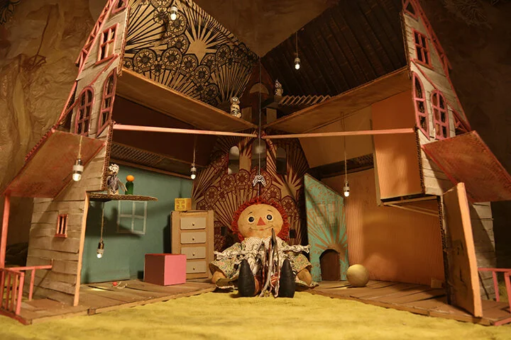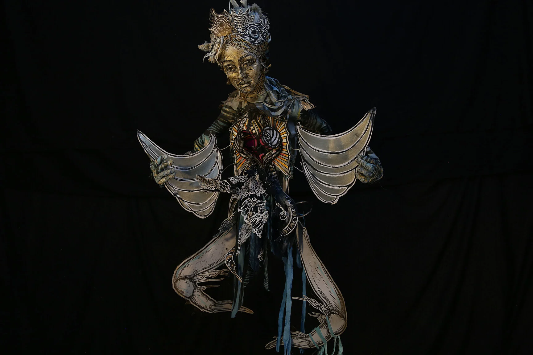 Cicada, Swoon’s first major stop-motion animation, is a meditation and celebration of emergence, growth, and transformation. Her personal story acts as a central narrative, but it is infused with elements drawn from classical mythology. Recurring motifs of this exhibition such as birth, divination, endurance, suffering, strength, and healing interweave and unfold throughout the film. Here, the corporeal body serves as a vessel carrying memories and traditions. A house, a ship, and human figures split open to liberate a cast of imaginative and mythological creatures. The central figure is the “Tarantula Mother,” a half-human, half-spider allegory that evokes harrowingmemories from Swoon’s childhood. The legacy of her parents’ addiction and substance abuse adds a strong element of realism to the film, grounding its otherwise-whimsical atmosphere. As an insect, the cicada is notable for spending much of its life underground, only emerging into adulthood after thirteen to seventeen years. In Cicada the artist expresses a similar ability, one shared by all of us, to molt and burst through one’s former self in a cycle of self-realization and self-healing. Surrounded by new sculptures and her portrait series, Cicada encourages us to immerse ourselves into Swoon’s world, embracinga vivid experience embedded in the present moment.